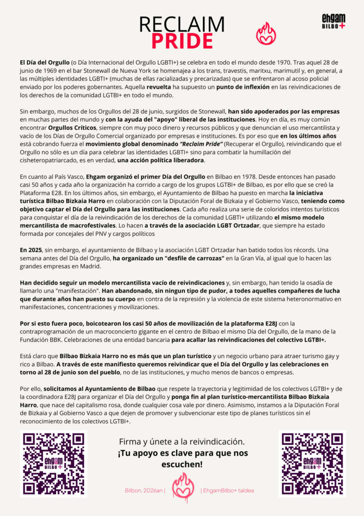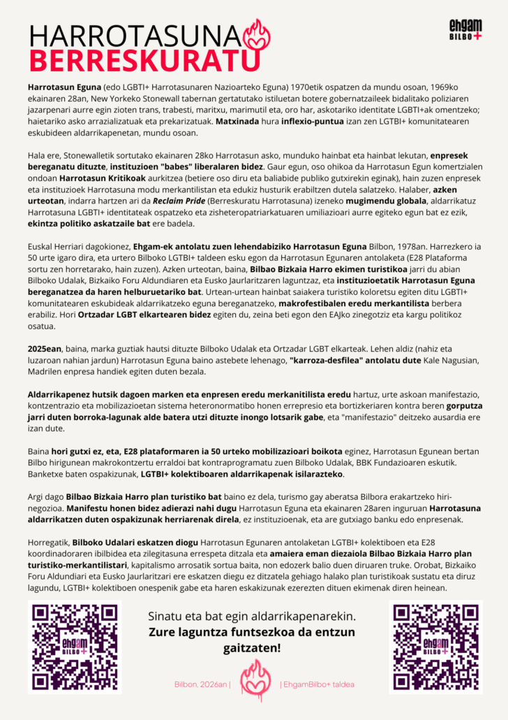 Bilboko Udalak E28a (LGTBI+ Harrotasunaren Eguna) bere egin nahi du, kontraprogramatuz eta bertako taldeen aldarrikapenak isilaraziz.